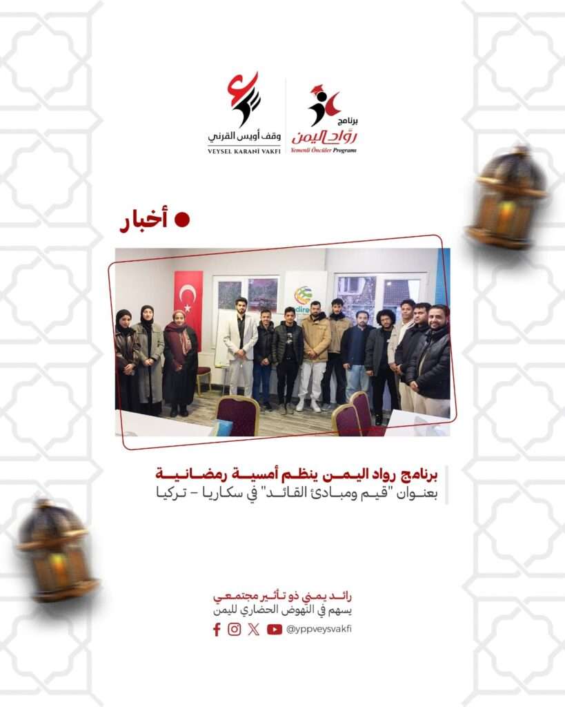 في إطار الزيارات الدورية لإدارة برنامج رواد اليمن ضمن المسارات التدريبية للرواد، نُظِّمت يوم 09 مارس 2026 في مدينة سكاريا أمسية رمضانية بعنوان “قيم ومبادئ القائد”، قدمها مدير البرامج في الوقف أ/ أيمن رياض.