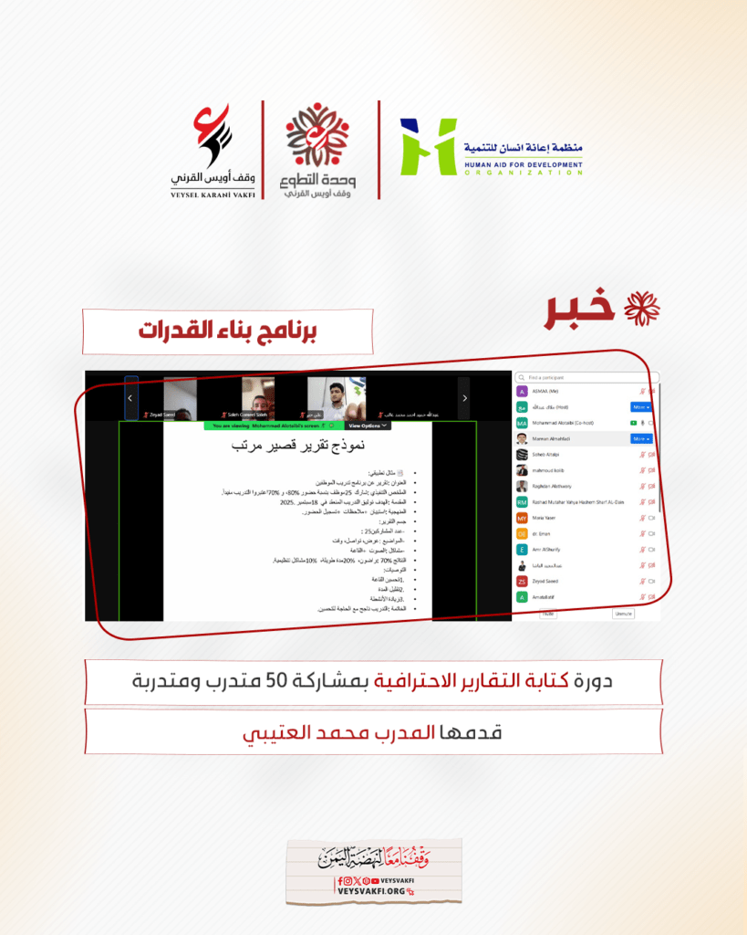 في إطار برنامجها الهادف إلى تطوير قدرات المتطوعين وتعزيز أثرهم المجتمعي، نظّمت وحدة التطوع بوقف أويس القرني يوم الثلاثاء الموافق 23 سبتمبر 2025م دورة تدريبية بعنوان “كتابة التقارير الاحترافية”، شارك فيها عدد من المتطوعين عبر برنامج زووم. قدّم الدورة المدرب محمد العتيبي، وتناولت أربعة محاور رئيسية: الفرق بين التقرير الوصفي والتحليلي. #وقف_أويس_القرني #وقفنا_معاً_ لنهضة_اليمن #تطوعك_وقف